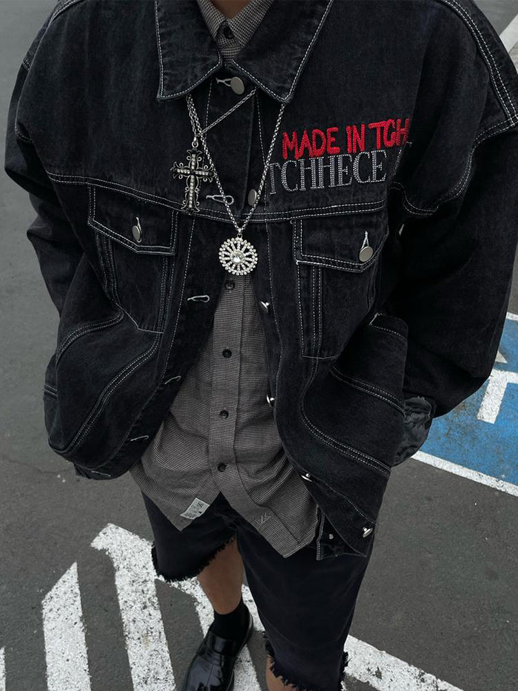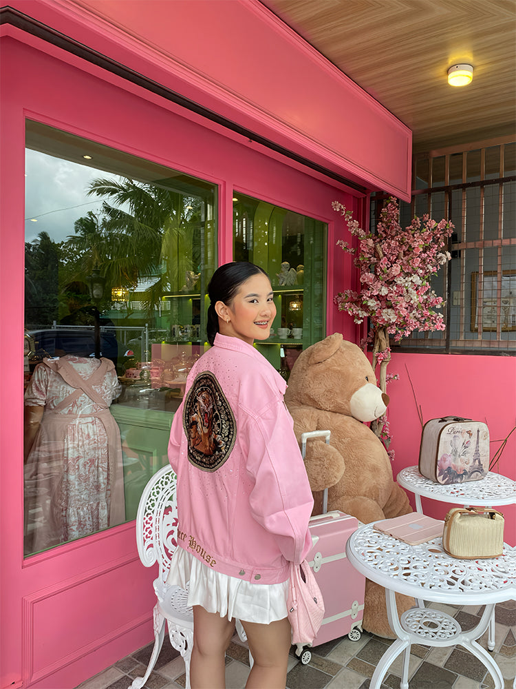 “A pink denim jacket that is perfect for spring. It is stylish and casual, and the rhinestone tiger pattern on the back is very shiny.”@ash clerigo