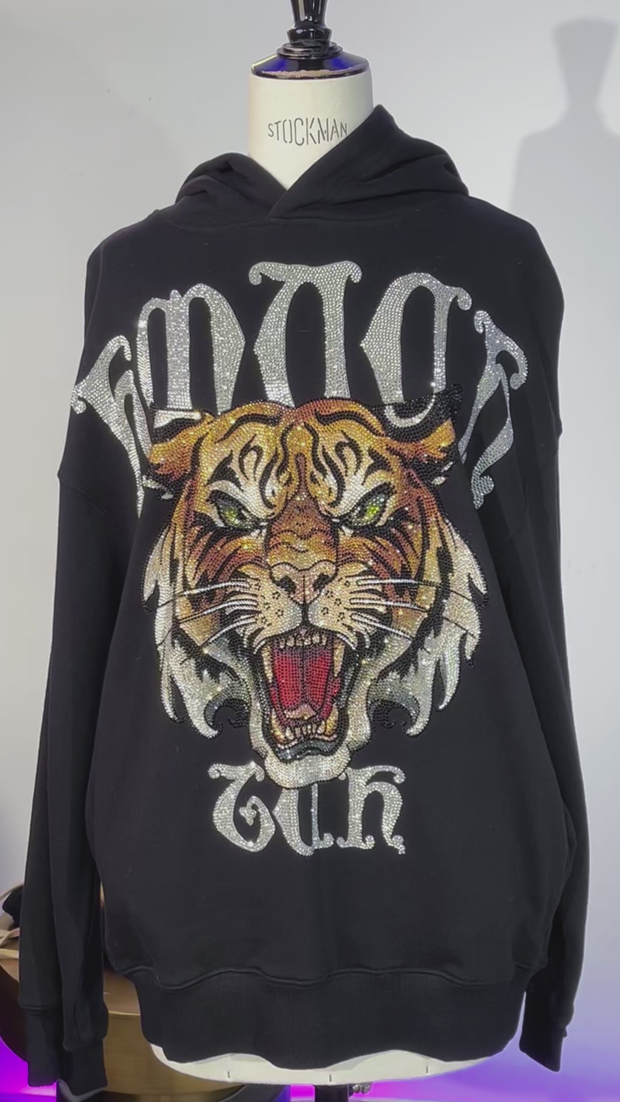 TCH Jacquard Tiger Rhinestone Black Hoodie